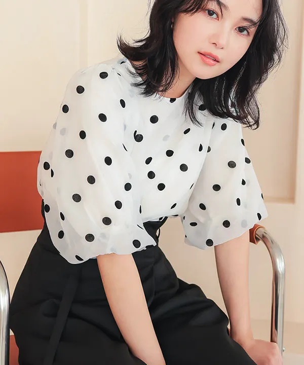 スタイリング華やぐエアリーブラウス。ふんわりと軽やかな雰囲気が女性らしく、ボリュームスリーブやフロッキードットなどトレンド感のあるデザインが映える一枚。デニムやカジュアルパンツに合わせてラフに着崩したり、上品なフォーマルスタイルにも様々なシーンで活躍してくれます。