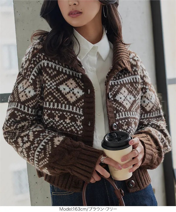 季節感あふれるノルディック柄ニット。秋冬らしい存在感たっぷりのアクセントでコーデの主役に。ケーブルやリブ編みで切り替えた編地のディティールにもこだわったデザインニットカーディガンです。