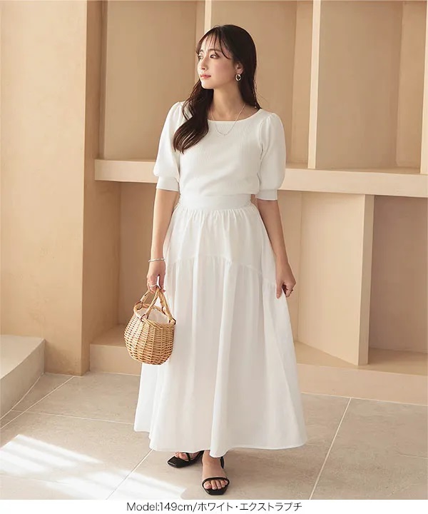 ハリ感のある綿混素材。ウエストから切り替えたフレアラインがさりげなく体型をカバーし、メリハリのあるシルエットで女性らしさを演出。シワになりにくく、デイリー使いに嬉しいご自宅でお手入れできるイージーケアアイテムです。