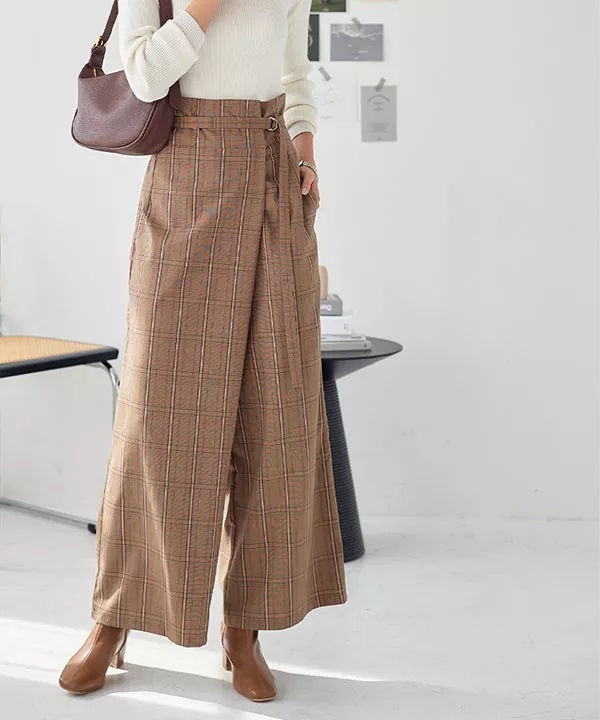 トレンドのワイドシルエットのラップ風パンツ。ストライプやチェック柄はシンプルなトップスに合わせて着用するだけでスタイリングが決まります。ベーシックな無地には色もの・柄ものトップスを合わせてこなれたコーディネートも◎。