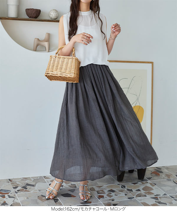 大人のリラックススタイルにうれしい楽ちんスカート。ニュアンスのあるシワ感や軽やかに揺れ動くたっぷりのドレープがコーデに雰囲気をもたらしてくれます。おうち時間にもぴったりの一品。選べる2丈展開です。