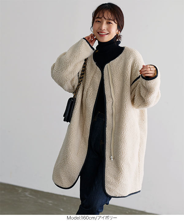 もこもことした肌触りで保温性の高いボア素材であつらえました。ボリューム感がありながらも軽い着心地で、着ぶくれしないのが嬉しいポイント。気になるヒップ周りをカバーしてくれる長めの着丈は、パンツやスカートなどボトムを選ばず着て頂けます◎。