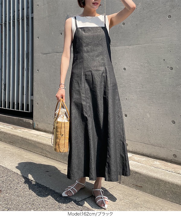 暑い時期にも着れる薄手で軽いライトデニム素材。華奢見えする細ストラップ、女性らしく身体に沿うデザインが大人っぽくスタイルアップ見えしてくれます。サイドファスナー使用で着脱しやすく、ストラップ部分は長さ調節可能です。