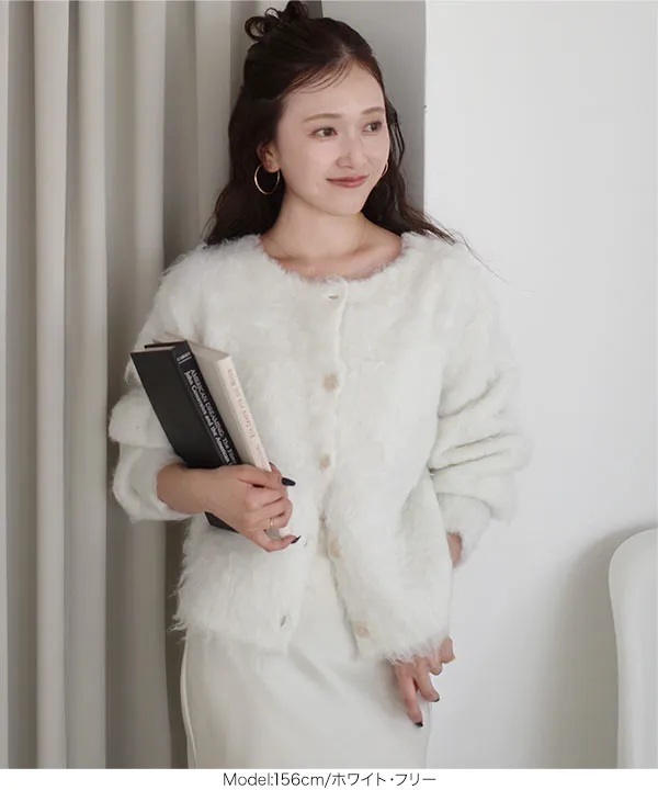 シーズンライクな表情魅せるシャギーニット素材。程よくライトな厚さで羽織るだけでサマになるオーバーシルエットながらすっきりと見せてくれるシルエット。抜け感を演出したりインナーのアレンジも広がるクルーネックニットカーデです。