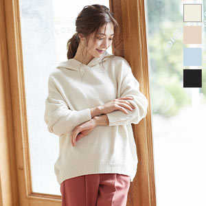 地球に優しい取り組みとして話題の、サスティナブル素材を使用したニットパーカー。フードデザインが今の気分にぴったりなニットプルオーバー。ネックはやや開きをもたせた女性らしいデザインで、タートルネックをインしたりとインナーでも遊んでいただけます。これからの季節に大活躍してくれるアイテム。
