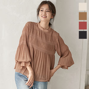 繊細な透け感がトレンド感たっぷりのシアーニットトップス。程よくあいたネックとギャザーが、リラックス感を出しながらでこなれた印象に。インナーとのレイヤードも楽しめます。
