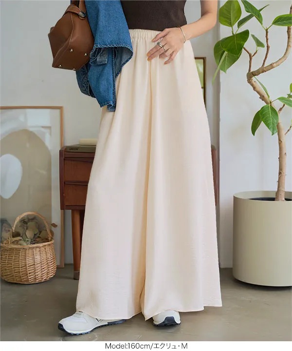 ハイウエスト仕様で、ウエストはほどよくフィット。ヒップや太ももにはゆとりがあり、脚のラインを拾いにくいシルエットです。動くたびにふわっと揺れるラインが女性らしさを引き立て、さりげない体型カバーも◎ゆるすぎず、すっきり見えが叶う、大人可愛いワイドデニムパンツです。