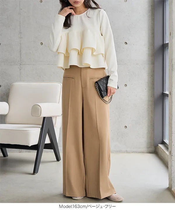 ワードローブに加えても出番が多いこと間違いなしのワイドパンツ。センタープレス入りでベーシックなデザインながら、フロントにポケットを付ける事でお手持ちのボトムとも気分を変えてお召し頂けます。