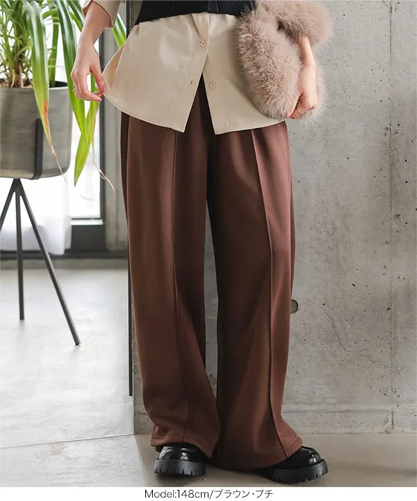 裏ボアでも広がりにくいワイドシルエットで、脚のラインを拾わず体型カバーが叶うラクちんサイズ感です。ウエスト総ゴムで快適な穿き心地ながら、フロントタックと縦ラインですっきり見え・脚長効果も期待できるのが魅力。着膨れしにくく重心が下がりにくいので、低身長さんがバランス良く穿きこなせる冬の優秀ボトムです。