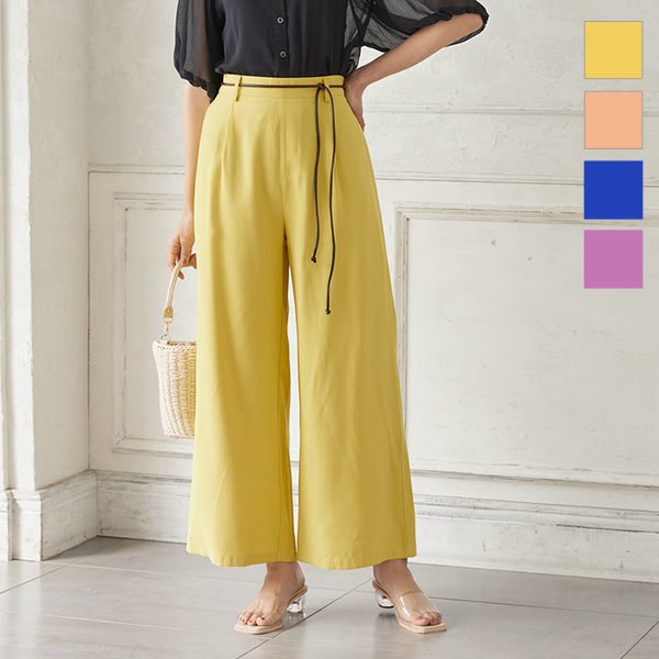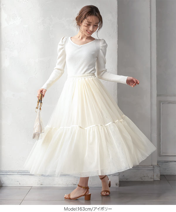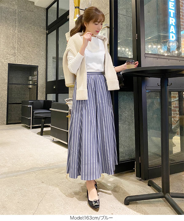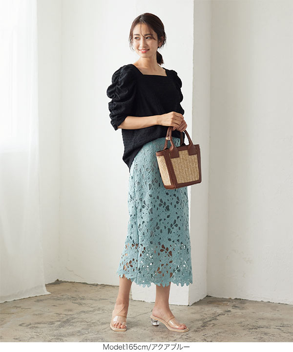 落ち感のあるライトな素材。ウエストは後ろ ゴム仕様なのでストレスフリーな履き心地。裏地付きで透けが気にならず、バックスリット入りで足さばきもスムーズ。長めの着丈が上品な印象を引き立てます。