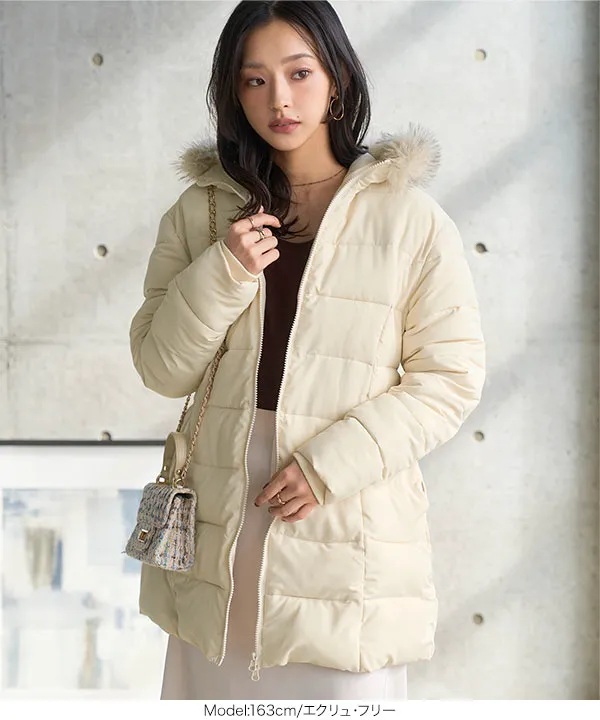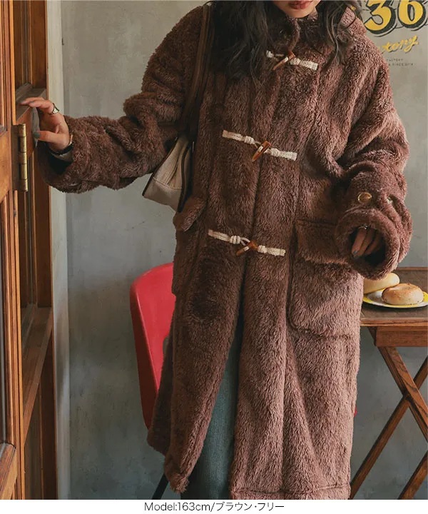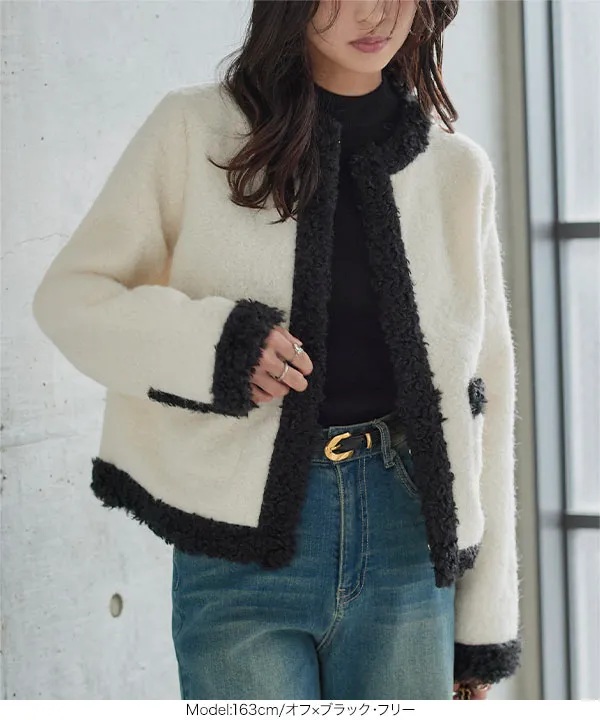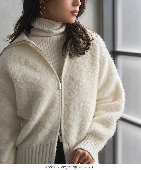 滑らかな質感が心地よいフェイクファー素材。さっと羽織りやすい軽い着心地でライトアウターとしても活躍。歩くたび揺れ動くファーが存在感をもたらしメリハリのあるスタイルに仕立ててくれるニットコートです。