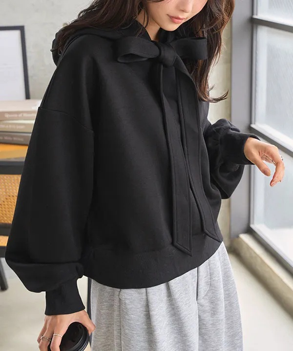 どこか上品に着れる大人可愛いフーディートップス。スウェットライクなカジュアルさに首元のビッグリボンが女性らしいデザイン性のあるアクセント。お顔周りを華やかに、且つ華奢見えを叶えてくれるプルオーバートップスです。