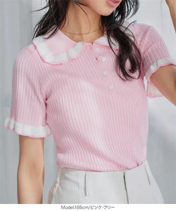 ストレッチのきいた半袖リブニット。ガーリー感を高めてくれるフリルデザインが可愛く、一枚で存在感のある着こなしに。レディからカジュアルまで幅広く合わせやすい万能さも魅力の襟付きニットです。